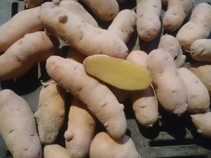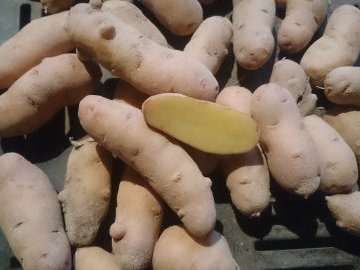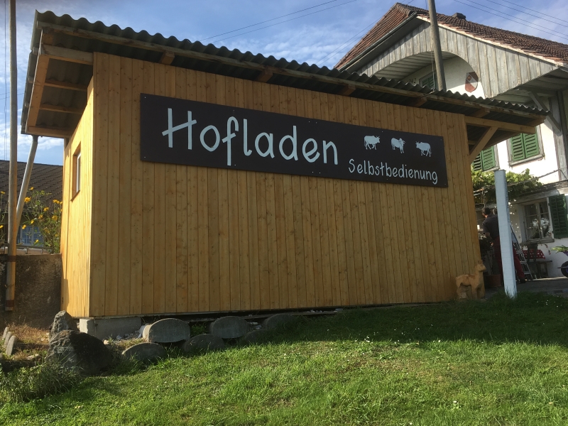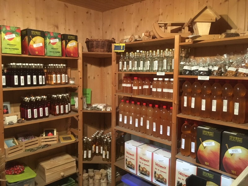 Frischfleisch, Wurstwaren, viele verschiedene Kartoffelsorten, farbige Kartoffeln, Eier, Mehl, Honig, Sirup, Rotweinsalz, verschiedene hausgemachte Senf, Taschen, Schlüsselanhänger, Handreme, Lippenbalsam, etc.